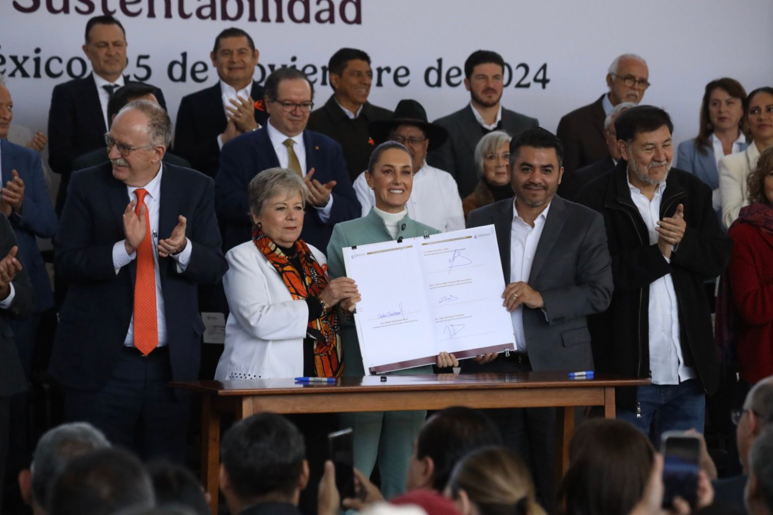 Ciudad de México; a 25 de noviembre de 2024.- El gobernador Manolo Jiménez Salinas acompañó a la presidenta Claudia Sheinbaum Pardo en la firma del Acuerdo Nacional por el Derecho Humano al Agua y la Sustentabilidad, el cual tiene como fin atender el estrés hídrico que vive nuestro país.