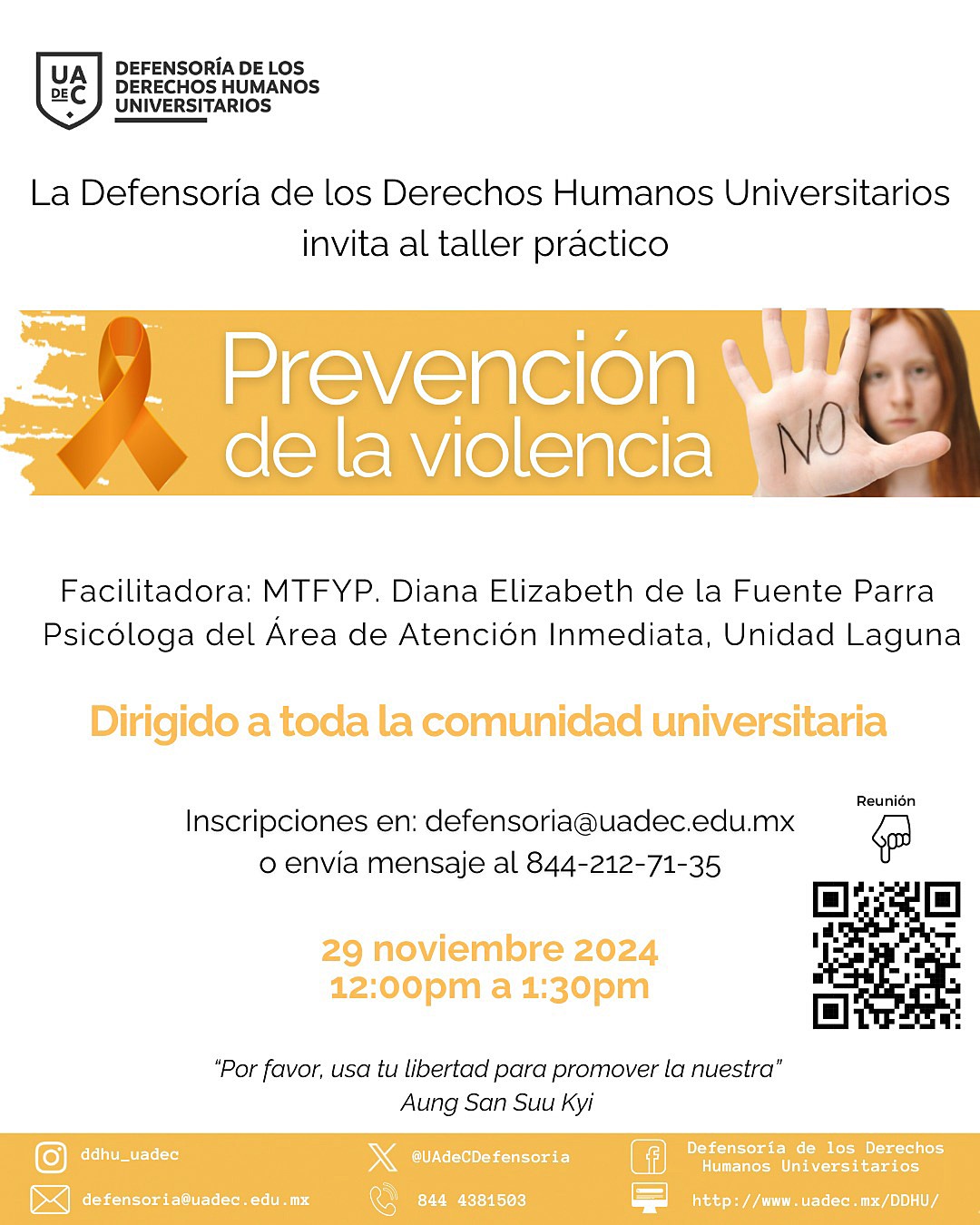 SALTILLO, Coahuila. 27 de noviembre de 2024. La Universidad Autónoma de Coahuila, a través de la Defensoría de los Derechos Humanos Universitarios (DDHU), invita a la comunidad universitaria de las Unidades Sureste, Laguna y Norte, a participar en el Taller “Prevención de la Violencia”, el cual se llevará a cabo por la plataforma Microsoft Teams el viernes 29 de noviembre de 2024 a las 12:00 horas.