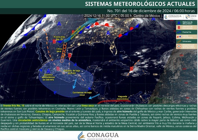Saltillo, Coahuila de Zaragoza; 16 de diciembre de 2024. La Subsecretaría de Protección Civil del Estado informa que, para este día, el frente frío número 15, en interacción con una línea seca ubicada en el noreste del país, generará chubascos acompañados de posibles descargas eléctricas, además de rachas de vientos fuertes y posibles tolvaneras en diversas regiones de Coahuila.
