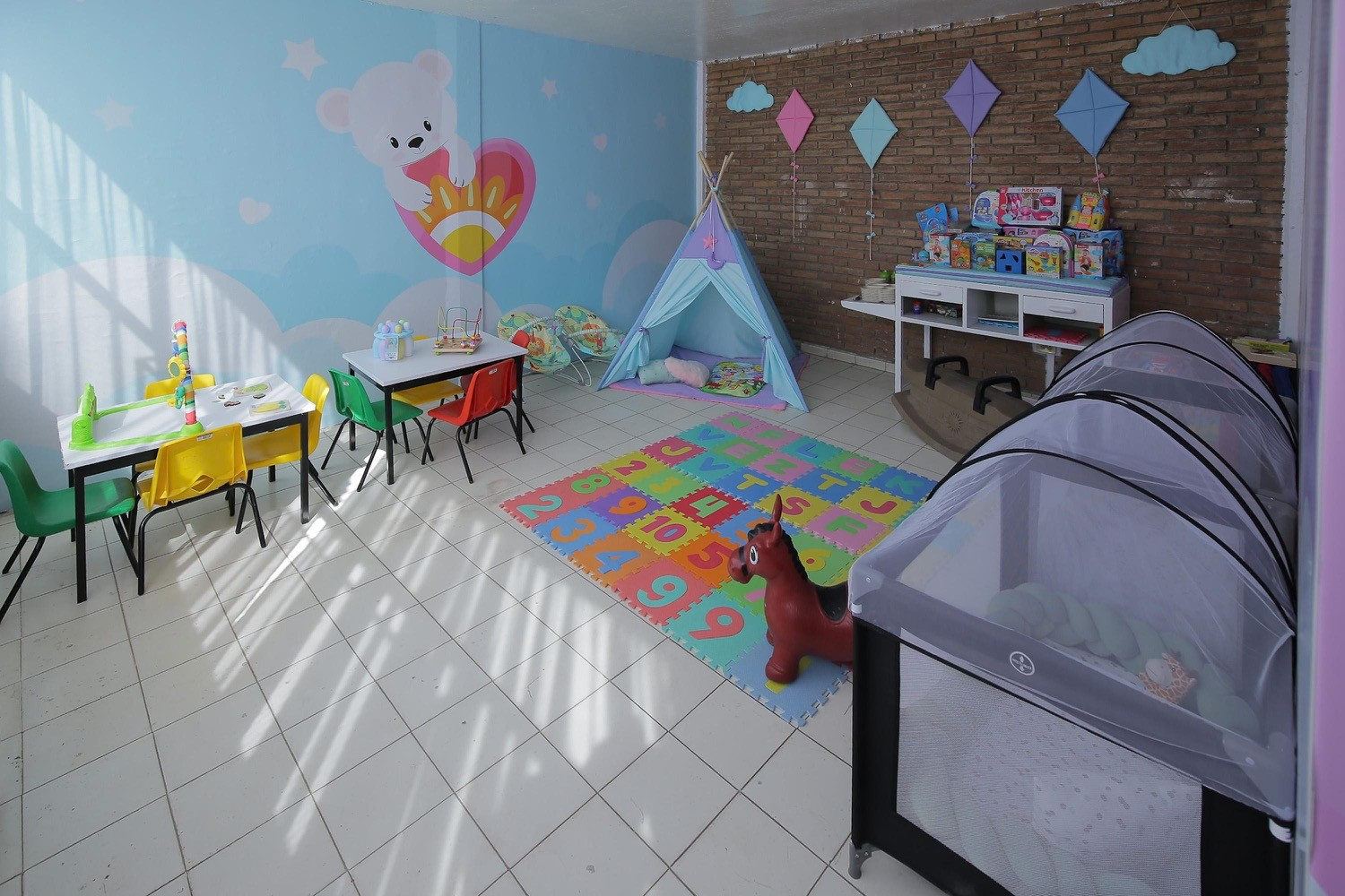 Se trata de un espacio que cumple con las características necesarias para el cuidado y la atención de los pequeños, equipado con juegos didácticos, colchonetas, cunas, mesas y sillas infantiles, mesa de exploración pediátrica, portabebés y juguetes. Hay cuatro personas capacitadoras para la atención y cuidado de la guardería, con perfil en psicología y trabajo social.