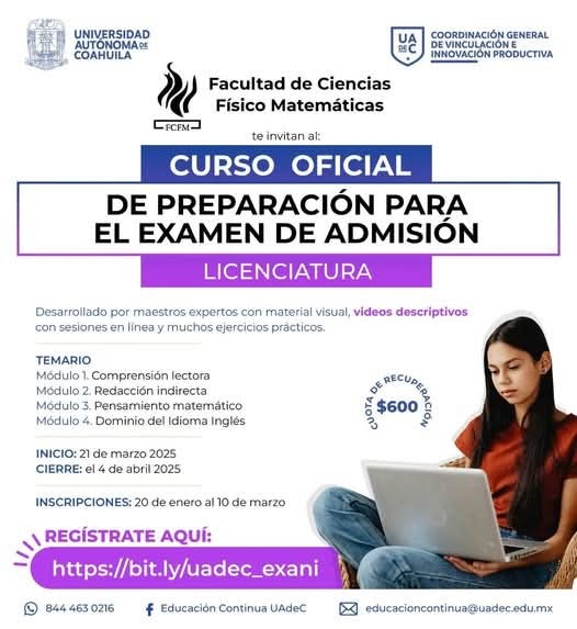 El curso está desarrollado por maestros expertos y cuenta con material visual como videos descriptivos, con sesiones en línea y una gran variedad de ejercicios prácticos, las inscripciones se encuentran abiertas y cierran el 3 de marzo para bachillerato y el para licenciatura el 10 de marzo a través del siguiente enlace https://bit.ly/uadec_exani.
