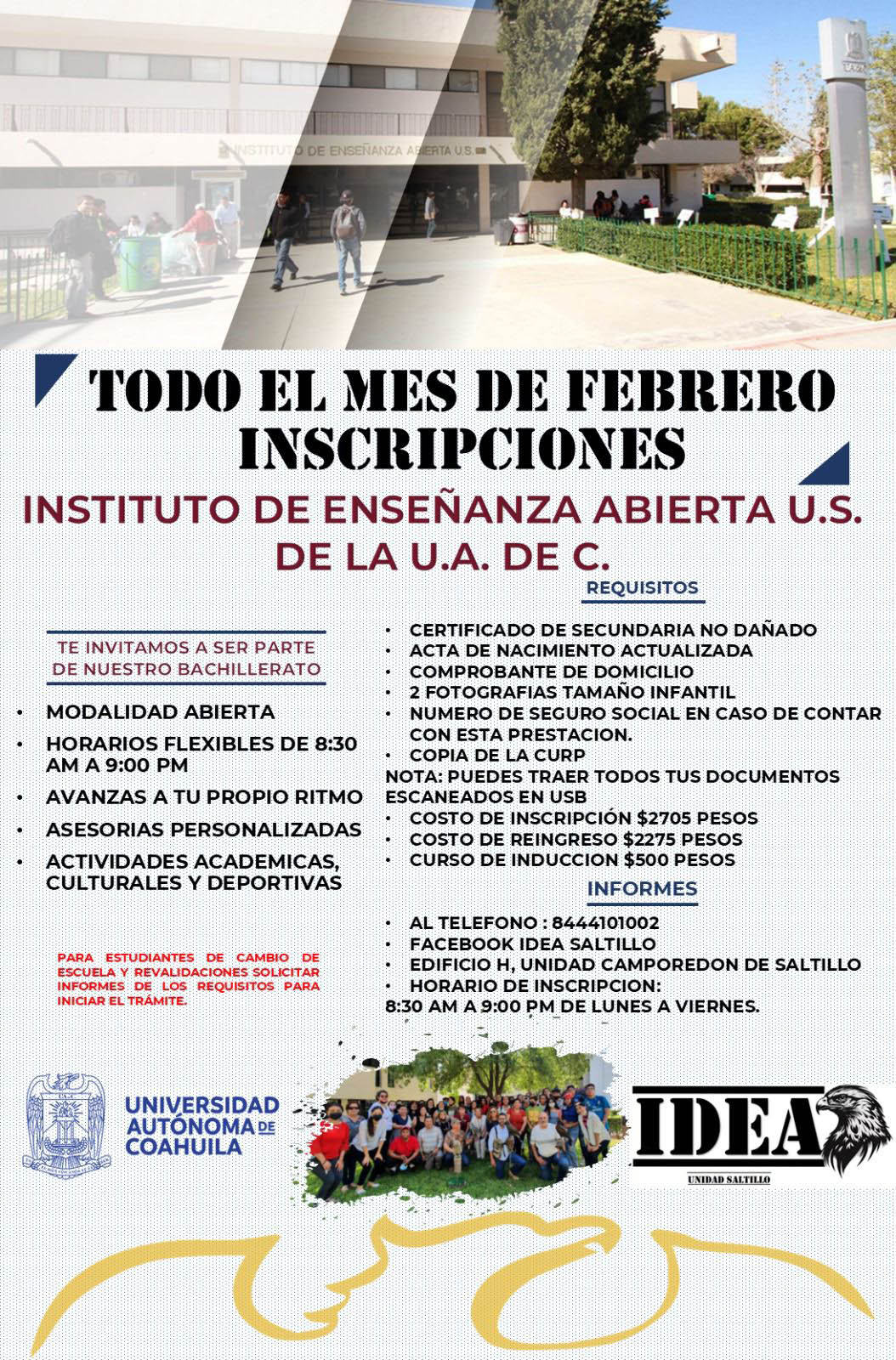 Para más información visitar la página de Facebook IDEA Saltillo, llamar al (844) 41 01 002 o acudir al plantel ubicado en el Edificio “H” de la Unidad Camporredondo en Saltillo, en un horario de lunes a viernes de 8:30 a 21:00 horas.