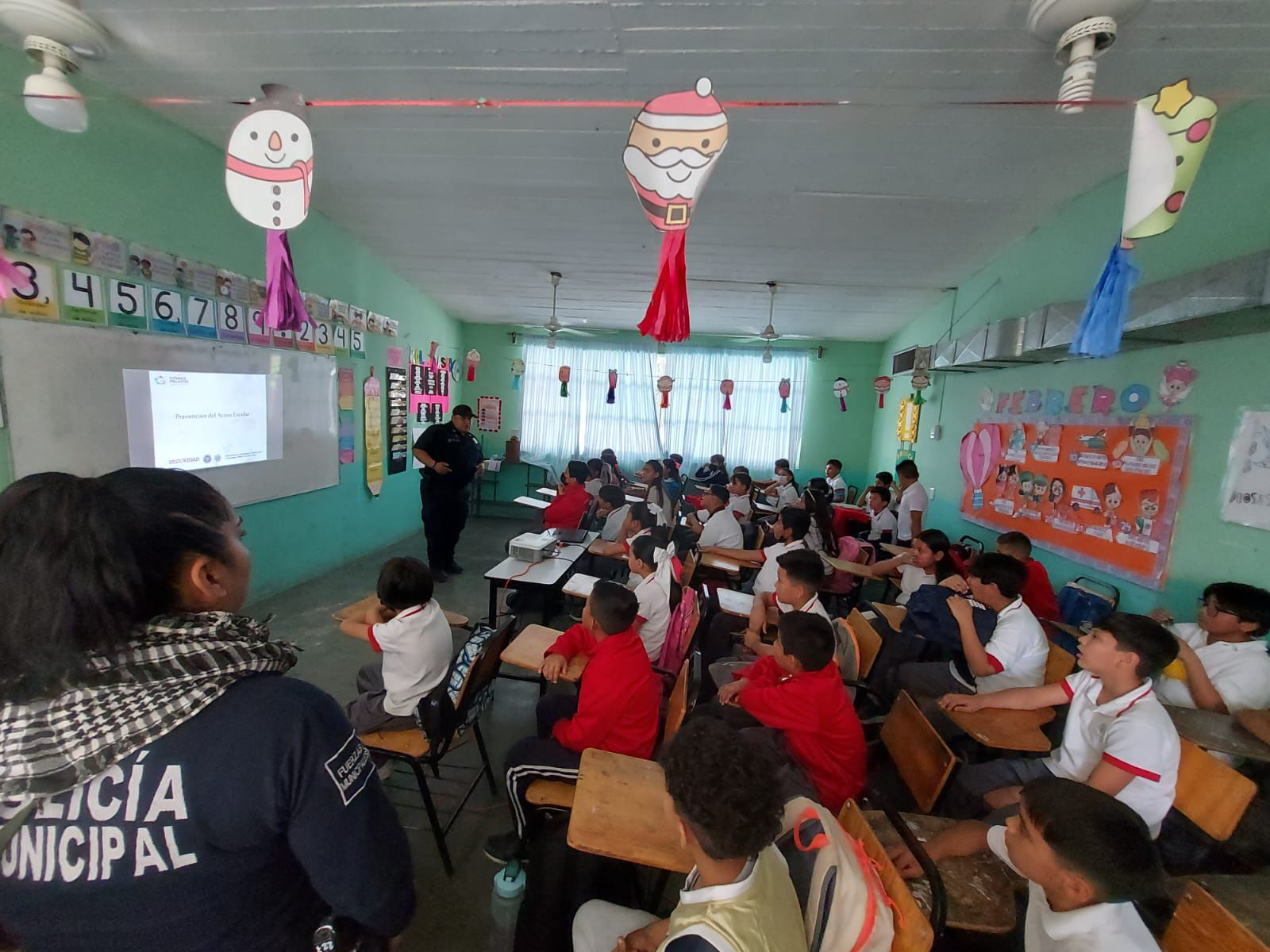 Abraham López Mata, responsable del Departamento de Prevención del Delito, explicó que durante las visitas a las escuelas se abordan temas clave para el bienestar de los estudiantes, como los derechos y responsabilidades de los jóvenes, acoso escolar y bullying, entre otros.