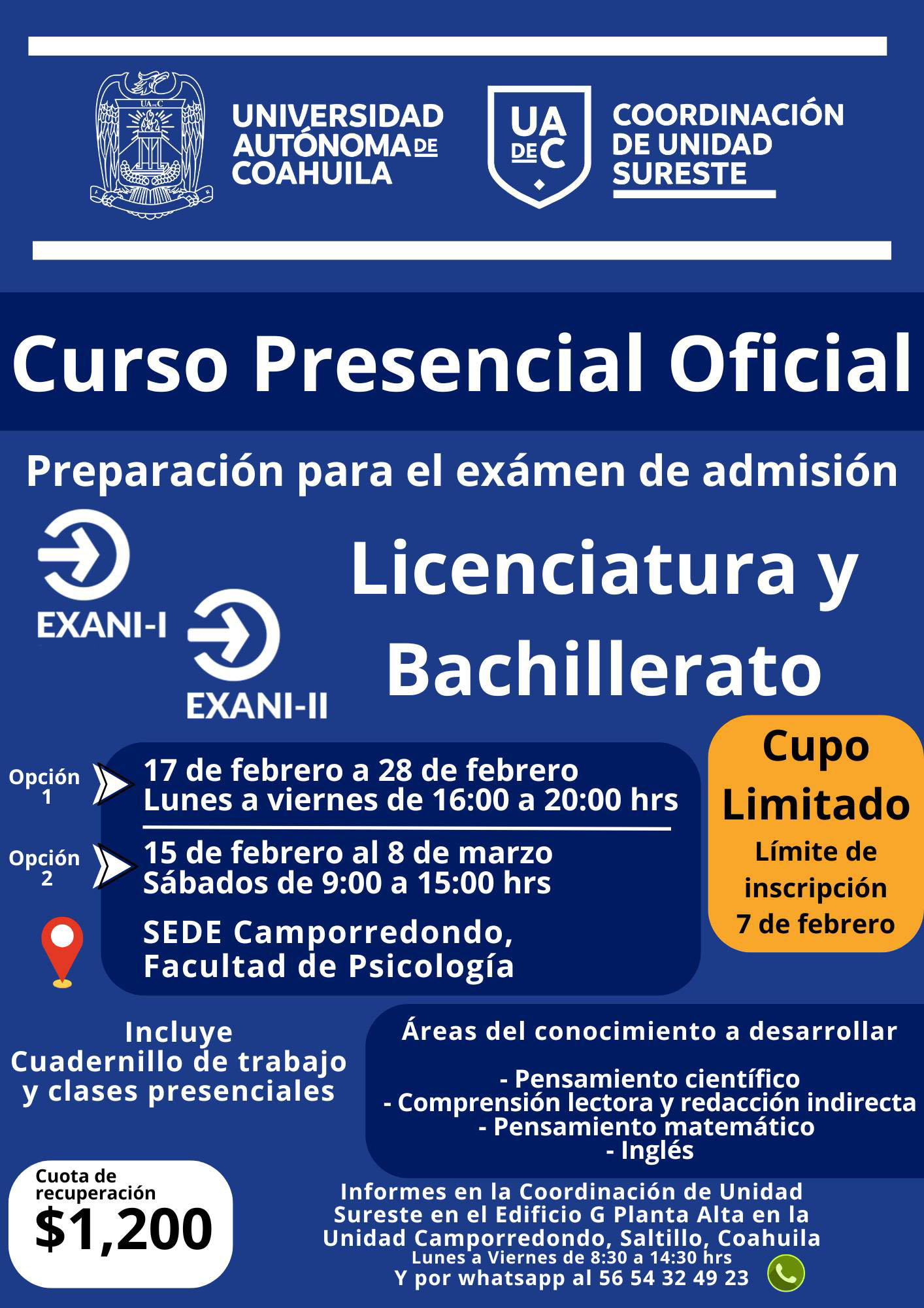 SALTILLO, Coahuila. 27 de enero de 2025. La Universidad Autónoma de Coahuila a través de la Coordinación de Unidad Sureste, invita a los aspirantes a ingresar a bachillerato y licenciatura a prepararse con el Curso Presencial Oficial para el Examen de Admisión, siendo este una opción para aquellos que no buscan una capacitación de manera virtual.