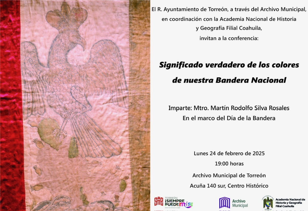 El Ayuntamiento de Torreón, a través del Archivo Municipal, en coordinación con la Academia Nacional de Historia y Geografía Filial Coahuila, invita a la conferencia: “Significado verdadero de los colores de nuestra Bandera Nacional”, que impartirá el Maestro Martín Rodolfo Silva Rosales, el próximo lunes 24 de febrero a las 19:00 horas.