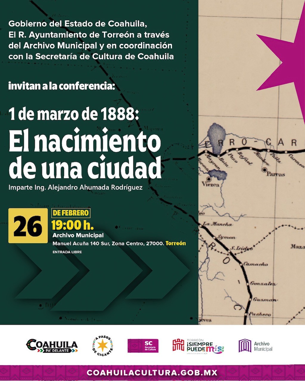 El Gobierno del Estado de Coahuila y el Ayuntamiento de Torreón, a través del Archivo Municipal, en coordinación con la Secretaría de Cultura de Coahuila, invitan a la conferencia: 1 de marzo de 1888: El nacimiento de una ciudad, a cargo de Alejandro Ahumada Rodríguez.