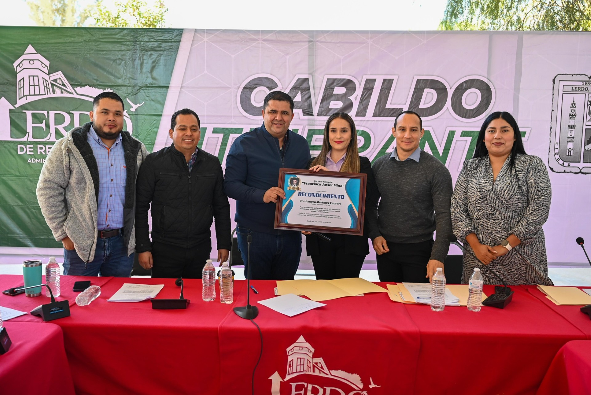 Al término de la sesión de Cabildo, la Directora de la Escuela Primaria Francisco Javier Mina, Maestra Paola Estefani Salmón González, entregó al Alcalde de Lerdo un reconocimiento, destacando su trabajo al frente de la administración, su compromiso con la educación y el apoyo que ha brindado a la institución.