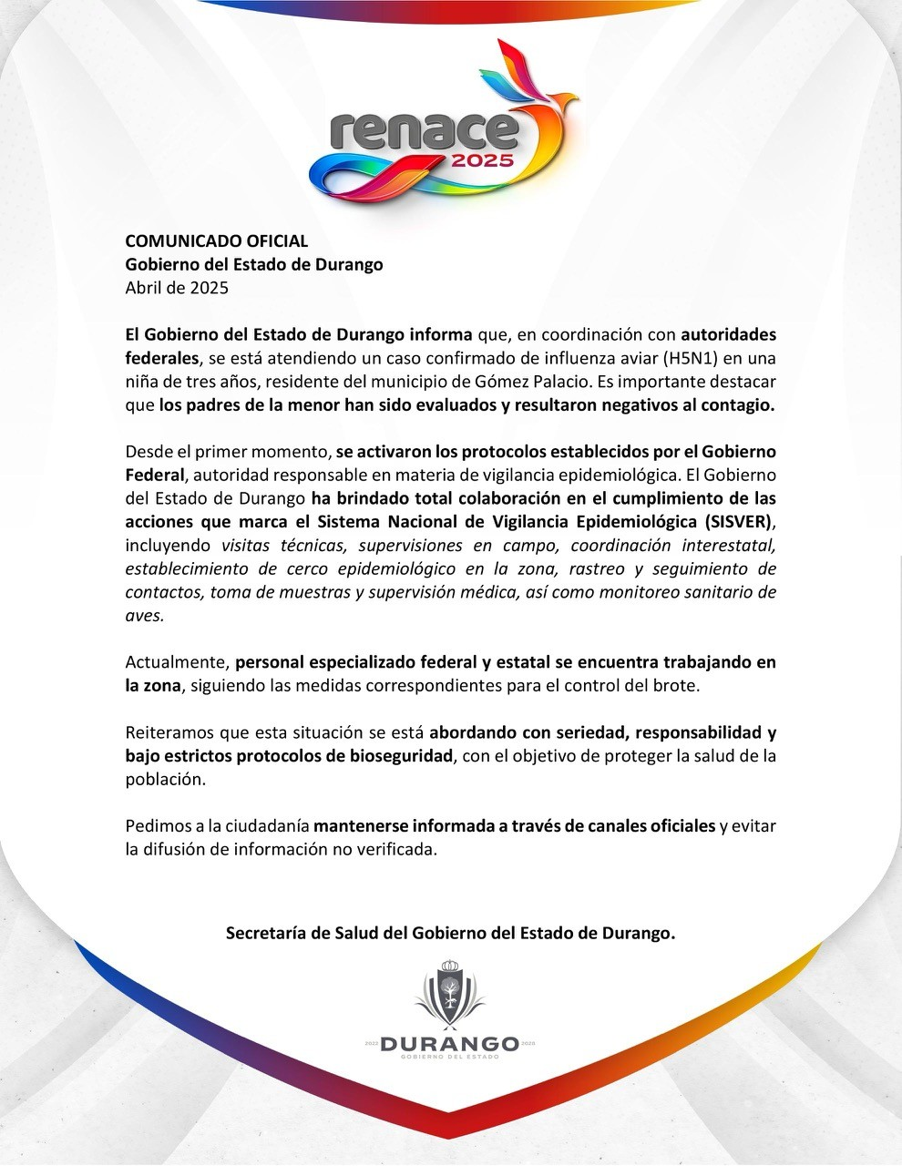 El Gobierno del Estado de Durango informa que, en coordinación con autoridades federales, se está atendiendo un caso confirmado de influenza aviar (H5N1) en una niña de tres años, residente del municipio de Gómez Palacio. Es importante destacar que los padres de la menor han sido evaluados y resultaron negativos al contagio.