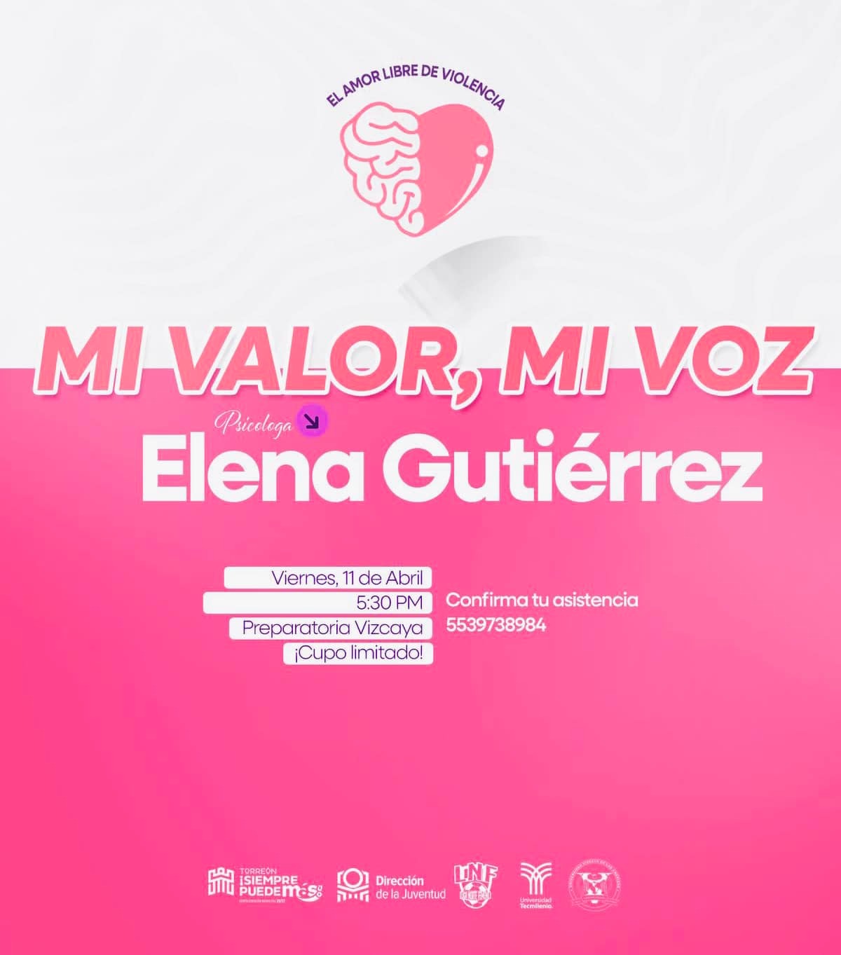 La Dirección de la Juventud, en colaboración con el colectivo “Mi valor, mi voz” del TecMilenio, Liga Norte Femenil y el Colegio Vizcaya, invitan a la conferencia: “El amor libre de violencia”, el próximo viernes 11 de abril a las 17:30 horas.