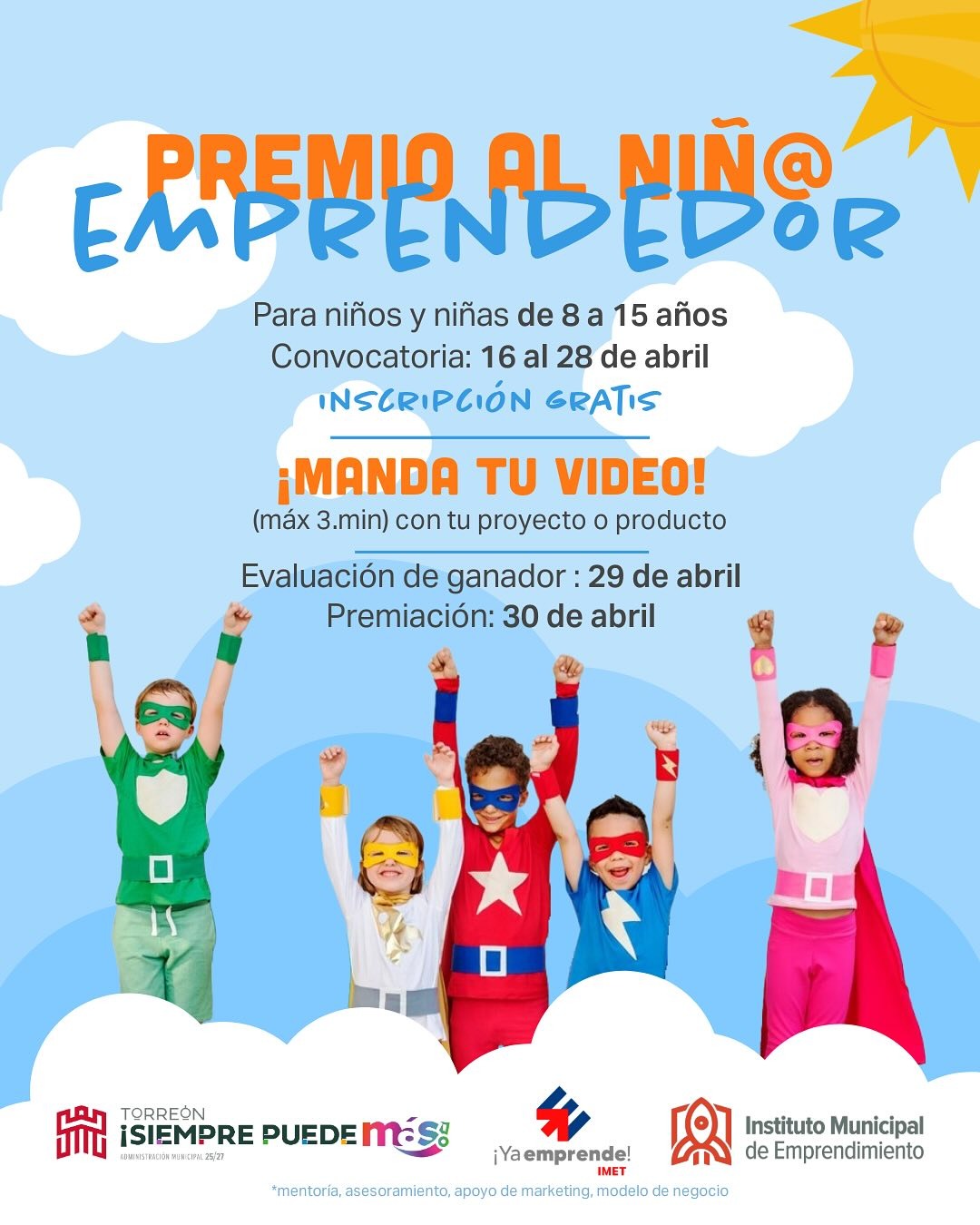 El Instituto Municipal del Emprendimiento de Torreón (IMET), invita a niños y niñas a participar en la convocatoria del concurso de innovación infantil “EMPRENDEkids – IMET”, espacio para que expongan sus ideas de cómo mejorar su comunidad, a través de la presentación de un proyecto en video.