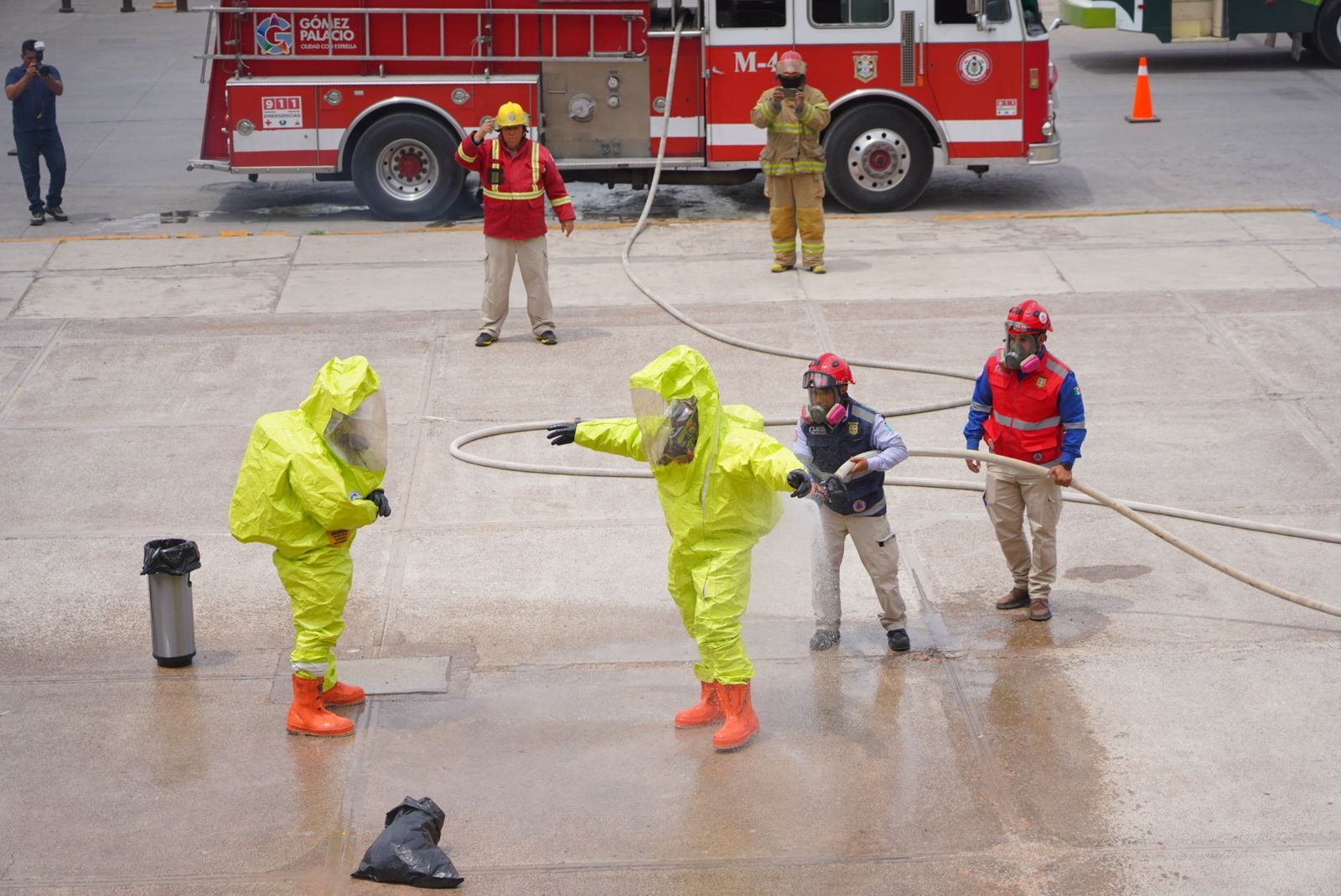 En el simulacro participaron elementos de Protección Civil, Tránsito y Vialidad, Seguridad Pública, Grupo GORI, Cruz Roja, así como el Cuerpo de Bomberos, incluyendo una unidad especializada en materiales peligrosos, quienes intervinieron en el rescate de la persona intoxicada, la atención prehospitalaria y el control de la sustancia simulada.