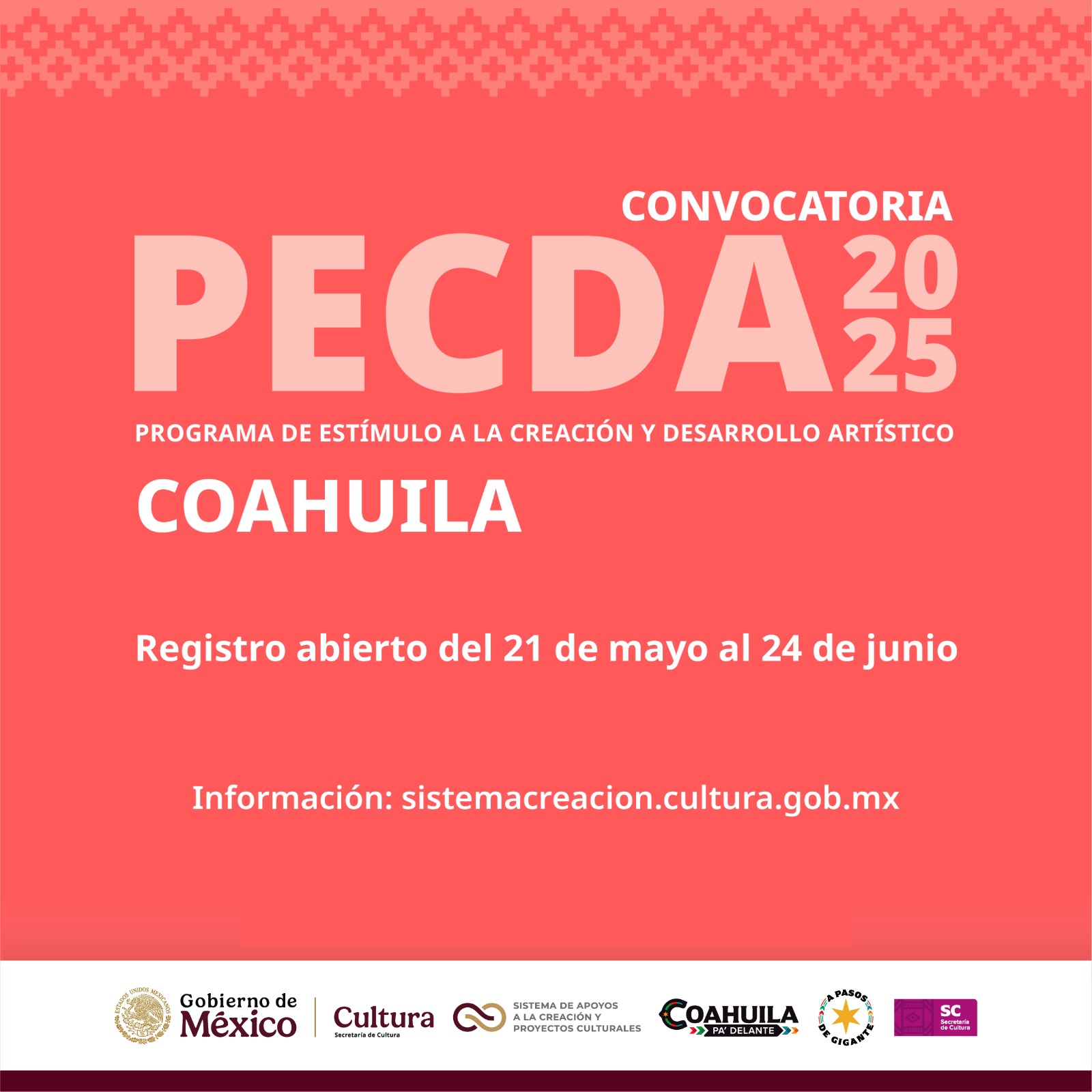 Saltillo, Coahuila de Zaragoza; 21 de mayo de 2025.– Con el objetivo de fortalecer el quehacer artístico y cultural en la entidad, el Gobierno del Estado de Coahuila de Zaragoza, a través de la Secretaría de Cultura, en coordinación con la Secretaría de Cultura del Gobierno de México mediante el Sistema de Apoyos a la Creación y a Proyectos Culturales, lanza la convocatoria del Programa de Estímulo a la Creación y al Desarrollo Artístico (PECDA) Coahuila 2025.
