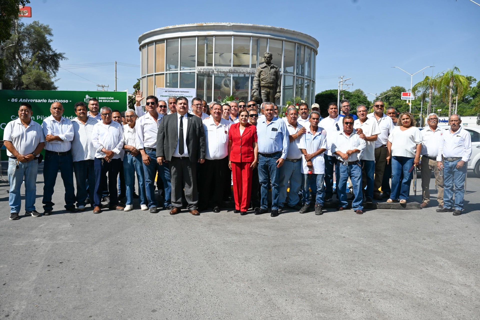 Frente el monumento del Capitán Piloto Aviador Francisco Sarabia Tinoco, en el Museo del renombrado piloto, el Ayuntamiento de Lerdo rindió homenaje a este ícono lerdense con un acto cívico y cultural, así como colocación de ofrenda floral y guardia de honor.