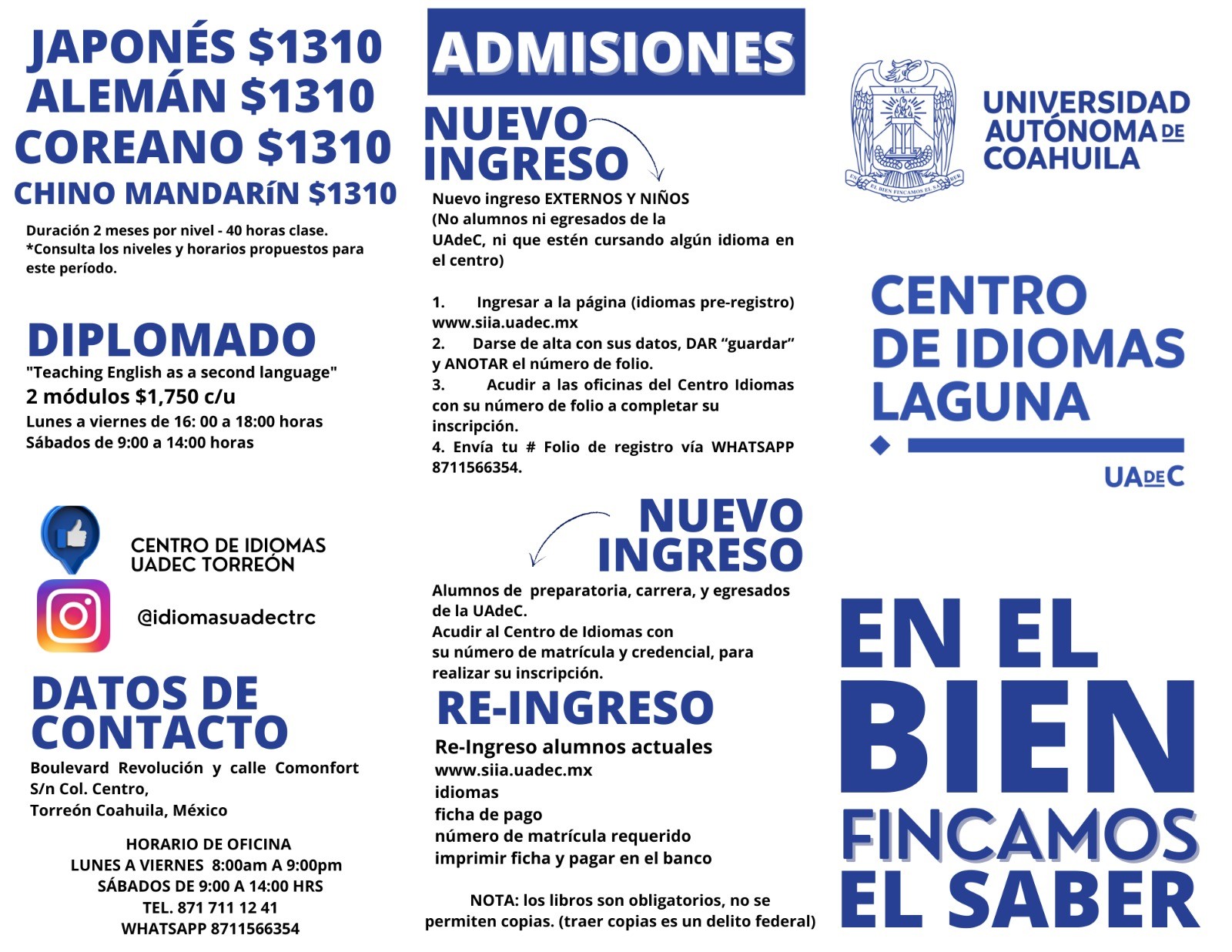 El Centro de Idiomas se ubica en bulevar Revolución y calle Comonfort s/n, en la colonia Centro de Torreón, el horario de atención es de lunes a viernes de 8:00 a 21:00 horas y los sábados de 9:00 a 14:00 horas; para más información, comunicarse al teléfono (871) 711 12 41 o visitar la cuenta de Instagram @idiomasuadectrc.