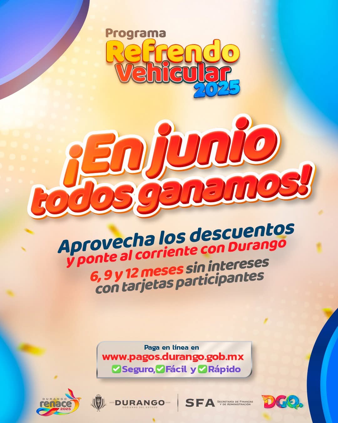 Comarca Lagunera, Dgo.- Con el objetivo de apoyar la economía de las familias duranguenses, el Gobierno del Estado de Durango, encabezado por Esteban Villegas Villarreal, recuerda a las y los contribuyentes que están por concluir los beneficios del Programa de Refrendo Vehicular 2025. Implementado por parte de la Secretaría de Finanzas, a través de los Centros Multipago de la entidad.