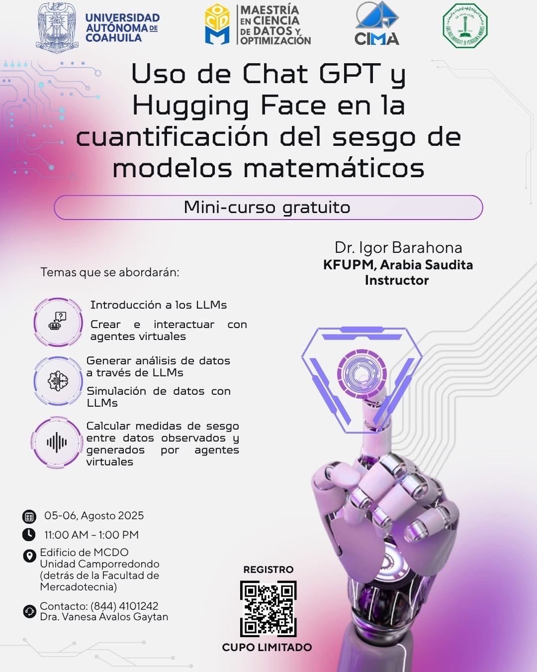Será impartido por el Dr. Igor Barahona de la Universidad King Fahd University of Petroleum and Minerals, Arabia Saudita, los interesados deberán de contar con laptop, cuenta en Hugging Face https://huggingface.com, cuenta en ChatGPT https://chatgpt.com, así como de Gmail y familiaridad básica con Python.