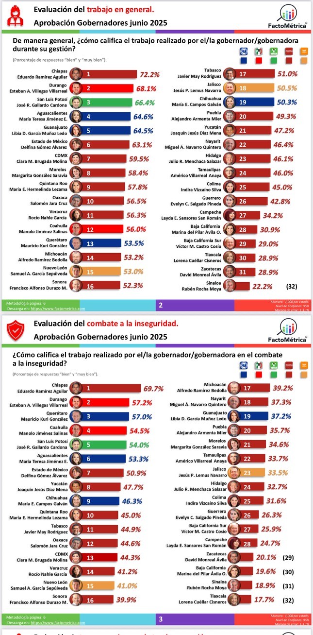 En términos de aprobación general, el mandatario duranguense obtuvo un 68.1%, colocándose en el segundo sitio del ranking nacional, por encima de sus homólogos en estados como Jalisco, Ciudad de México y Puebla.