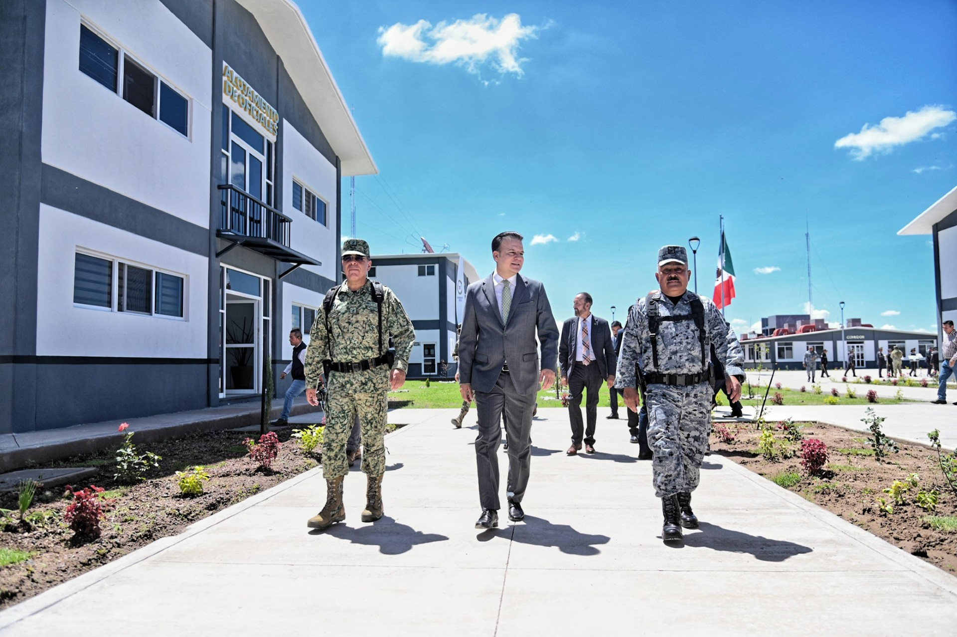 Durante el recorrido por las instalaciones de este predio, acompañaron al Gobernador, el General de División de Estado Mayor, Guillermo Briceño Lobera, Comandante de la Tercera Región Militar; el General Brigadier del Estado Mayor, Alfredo Montiel Godínez, coordinador Estatal de la Guardia Nacional en el estado, Héctor Vela Valenzuela, secretario de Gobierno, Sonia Yadira de la Garza Fragoso, Fiscal General del Estado, Bonifacio Herrera Rivera, presidente Municipal, Héctor Herrera Núñez, presidente del Congreso del Estado; el General de Brigada del Estado Mayor, Salvador Alvarado Ramírez, Víctor Fernando Ruiz Méndez, Fiscal Federal del Estado; Ángel Gerardo Bonilla Saucedo, presidente del Tribunal Superior de Justicia, y Óscar Galván Villarreal, secretario de Seguridad Pública.