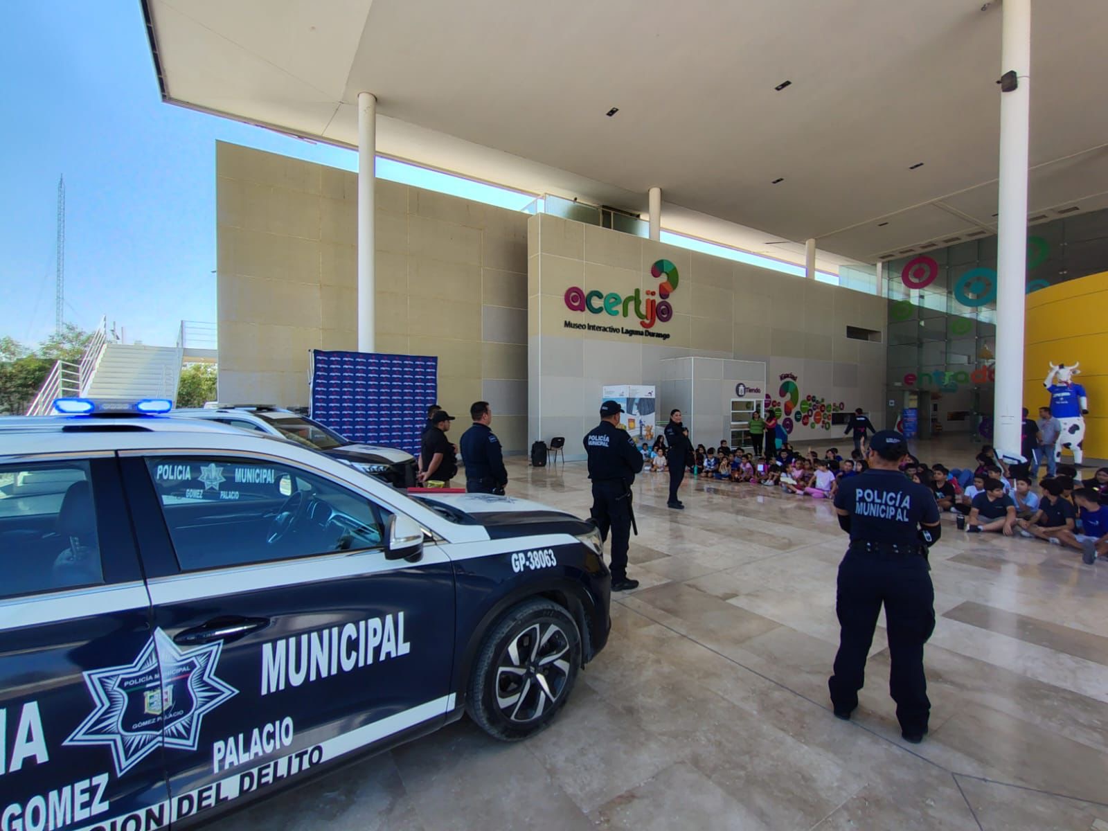 Con el propósito de acercar a las niñas y niños al trabajo que realizan los cuerpos de seguridad y fomentar una cultura de respeto y confianza hacia la policía, el Ayuntamiento de Gómez Palacio, a través de la Dirección de Seguridad Pública y Protección Ciudadana, llevó a cabo una jornada de proximidad social dirigida a los participantes del curso de verano del Museo Interactivo Acertijo.