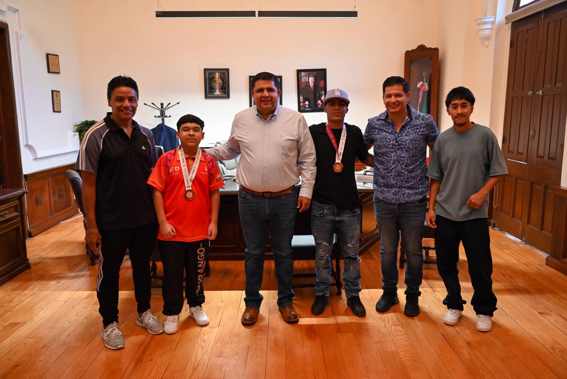 Lerdo, 12 de agosto de 2025.- El Presidente Municipal de Lerdo, Homero Martínez Cabrera, recibió en su despacho a los medallistas lerdenses que participaron en los Juegos Nacionales Conade 2025, en las disciplinas de taekwondo y boxeo, donde obtuvieron dos medallas de bronce para el estado de Durango.