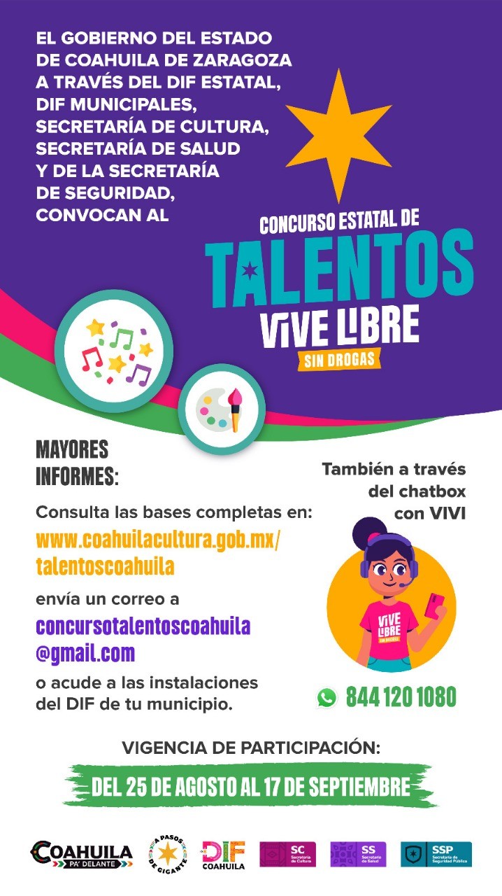 Saltillo, Coahuila; a 4 de septiembre de 2025.- El Gobierno del Estado de Coahuila de Zaragoza, a través del DIF Coahuila y la Secretaría de Cultura, en el marco del programa “Vive Libre Sin Drogas”, invita a las y los coahuilenses de los 38 municipios a participar en el Concurso Estatal de Talentos “Vive Libre sin Drogas”.