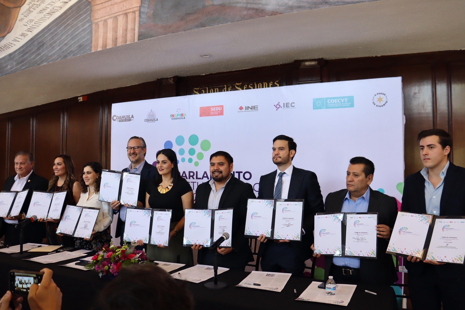 El Instituto Electoral de Coahuila (IEC), el Poder Legislativo del Estado, la Junta Local Ejecutiva del Instituto Nacional Electoral (INE), la Secretaría de Educación (Sedu) en la entidad y el Consejo Estatal de Ciencia y Tecnología (Coecyt), firmaron la mañana de este viernes 05 de septiembre un Convenio de Colaboración con el objetivo de organizar, difundir y realizar el Parlamento Estudiantil 2025.