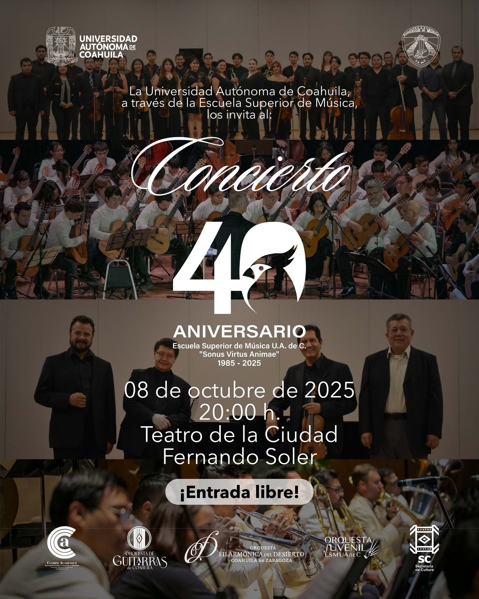SALTILLO, Coahuila. 29 de septiembre de 2025. La Escuela Superior de Música (ESMUADEC) de la Universidad Autónoma de Coahuila, invita a la comunidad universitaria y público en general a asistir a su Concierto de 40 Aniversario, que se llevará a cabo el 8 de octubre de 2025 a las 20:00 horas en el Teatro de la Ciudad “Fernando Soler”.