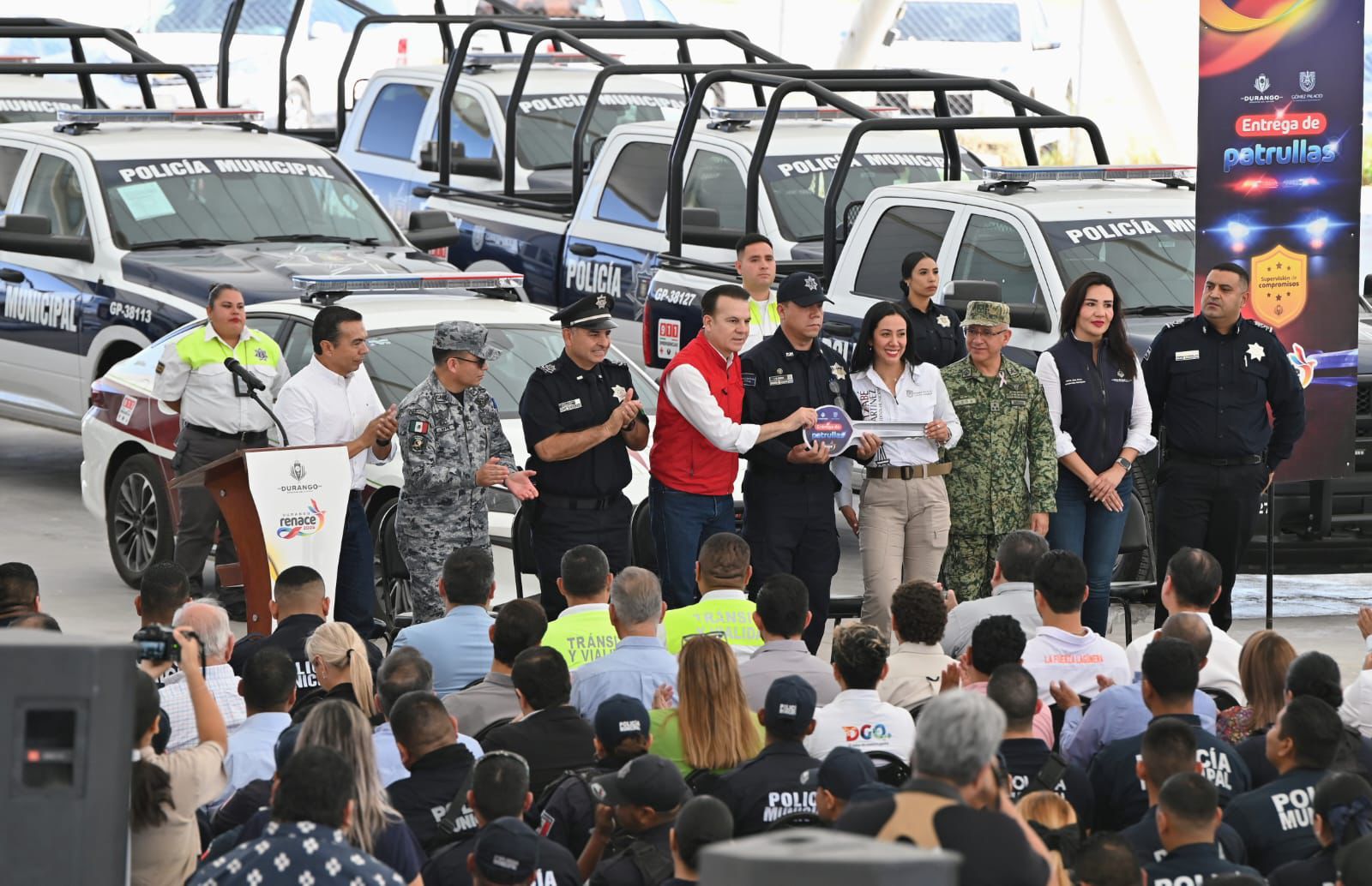 La Presidenta Municipal de Gómez Palacio, Betzabé Martínez Arango, encabezó la entrega de 43 nuevas patrullas para Seguridad Pública Municipal, con el objetivo de fortalecer la coordinación y el trabajo conjunto entre la Federación, el Estado y el Municipio en materia de seguridad, en colaboración con el Gobernador del Estado de Durango, Esteban Villegas Villarreal.
