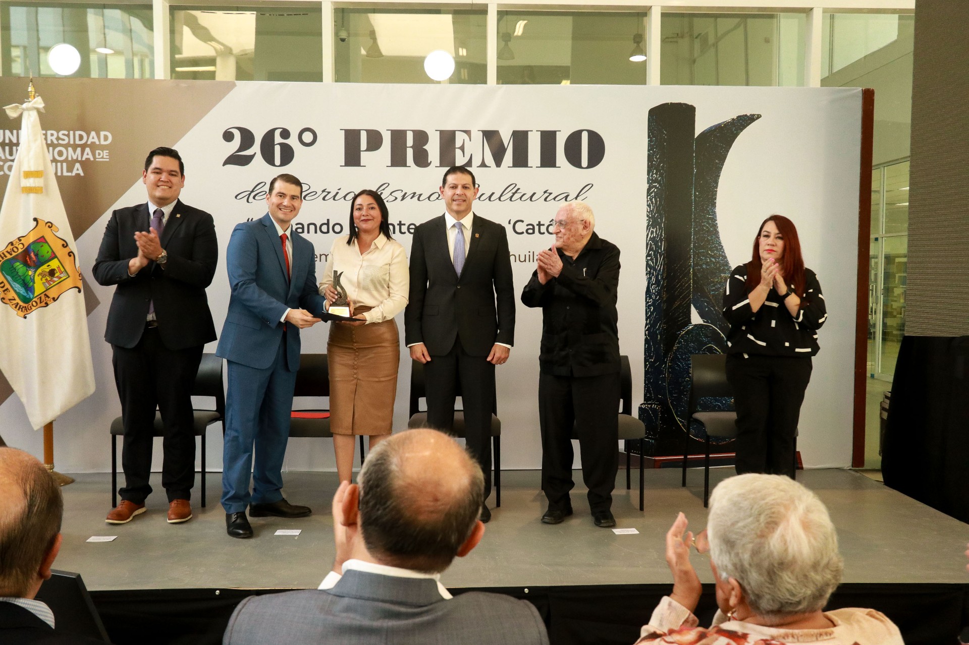 ARTEAGA, Coahuila. 7 de noviembre de 2025. La Universidad Autónoma de Coahuila, entregó la vigésima sexta edición del Premio de Periodismo Cultural Armando Fuentes Aguirre “Catón”, con la que se reconoció a periodistas en las categorías de prensa, radio, televisión, impacto social y trayectoria.