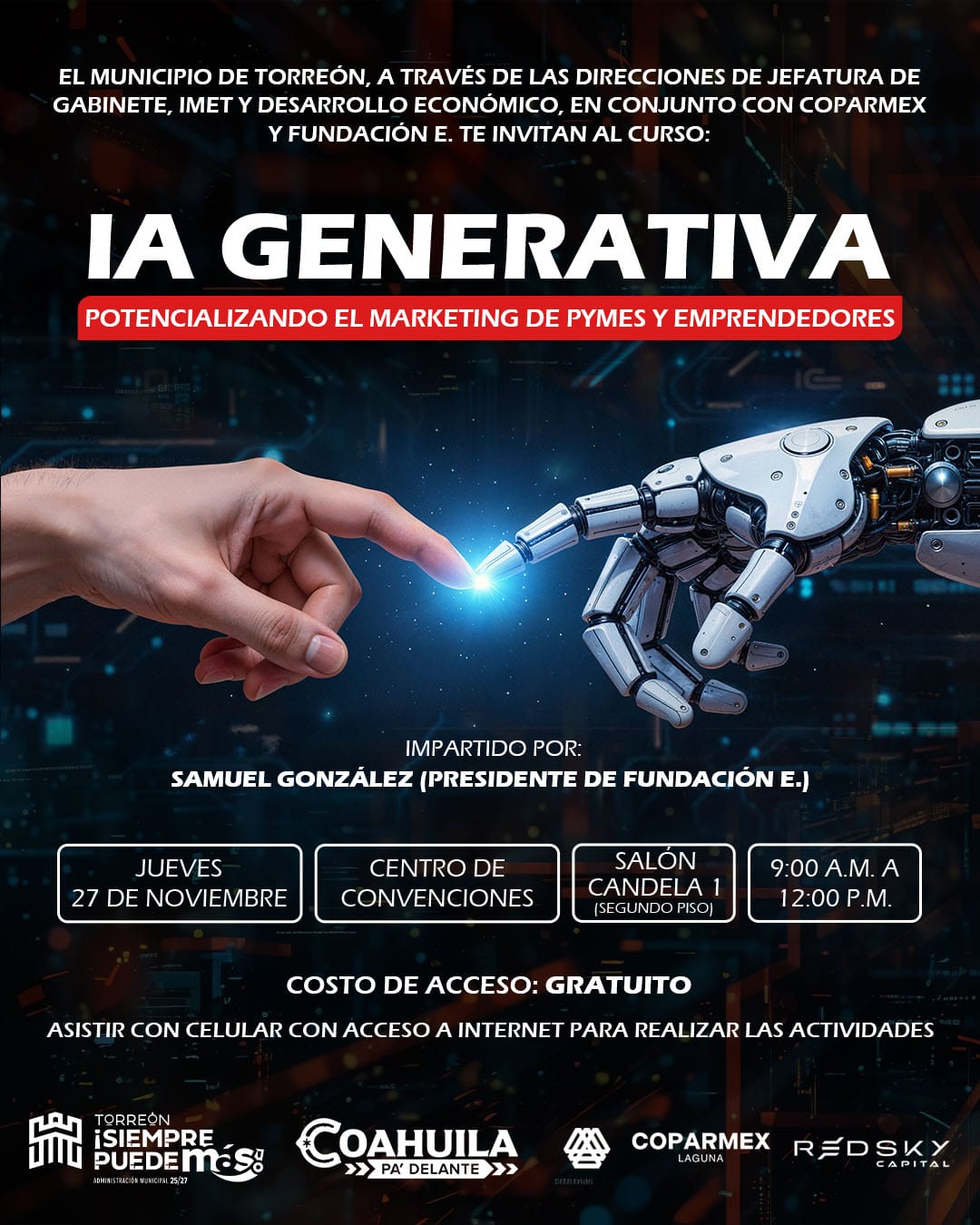 Con el objetivo de capacitar a los pequeños y medianos emprendedores en cuanto al uso de la Inteligencia Artificial para que potencialicen la venta de sus productos o servicios, la Administración Municipal invita al curso “IA Generativa: Potencializando el Marketing de PYMES y Emprendedores”, el cual será impartido por Samuel González, presidente de Fundación E, el próximo 27 de noviembre.