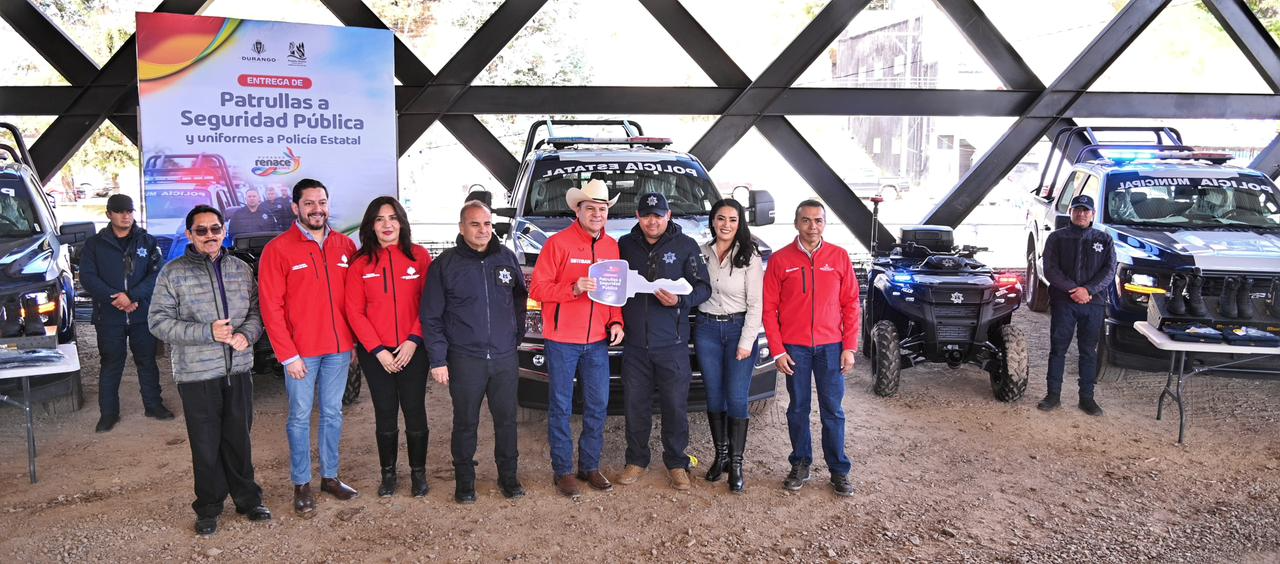 El Salto, Pueblo Nuevo, Dgo.– “Vamos a seguir construyendo un Durango seguro y con tranquilidad para las familias”, afirmó el gobernador Esteban Villegas Villarreal al entregar tres patrullas, dos cuatrimotos y uniformes para elementos de Seguridad Pública, así como equipamiento destinado a la Fiscalía General del Estado, esto como parte del programa estatal de 320 millones de pesos para fortalecer a las corporaciones de seguridad con tecnología, cámaras, radios, antenas y vehículos en los municipios.
