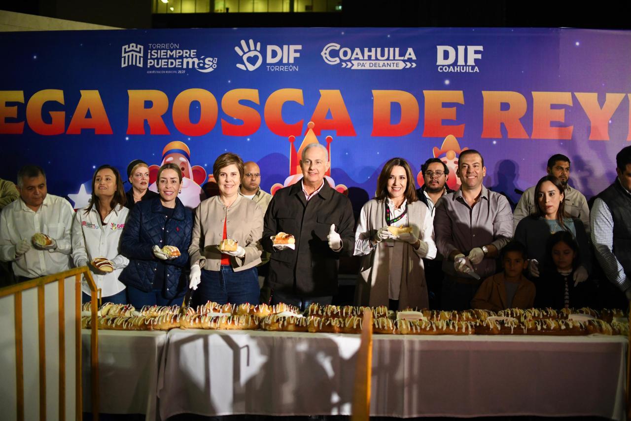 El alcalde Román Alberto Cepeda González, acompañado de la señora Selina Bremer de Cepeda, presidenta honoraria del DIF Torreón, así como de autoridades municipales y estatales, compartió la tradicional Mega Rosca de Reyes con 15 mil personas en la explanada de la Plaza Mayor.