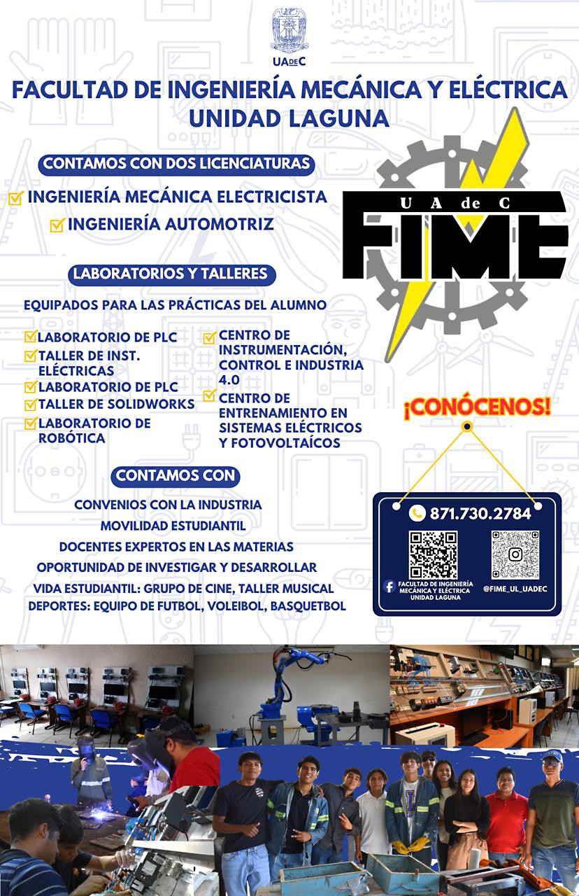 Para más información sobre estos planes de estudio, pueden acudir a la FIME Unidad Laguna, ubicada en la Carretera Torreón–Matamoros km 7.5, en Ciudad Universitaria, Ejido El Águila; comunicarse al teléfono (871) 730 27 84, o consultar las redes sociales oficiales en Facebook: Facultad de Ingeniería Mecánica y Eléctrica Unidad Laguna e Instagram: @FacultaddeIngenieríaMecánicayEléctricaU.L.