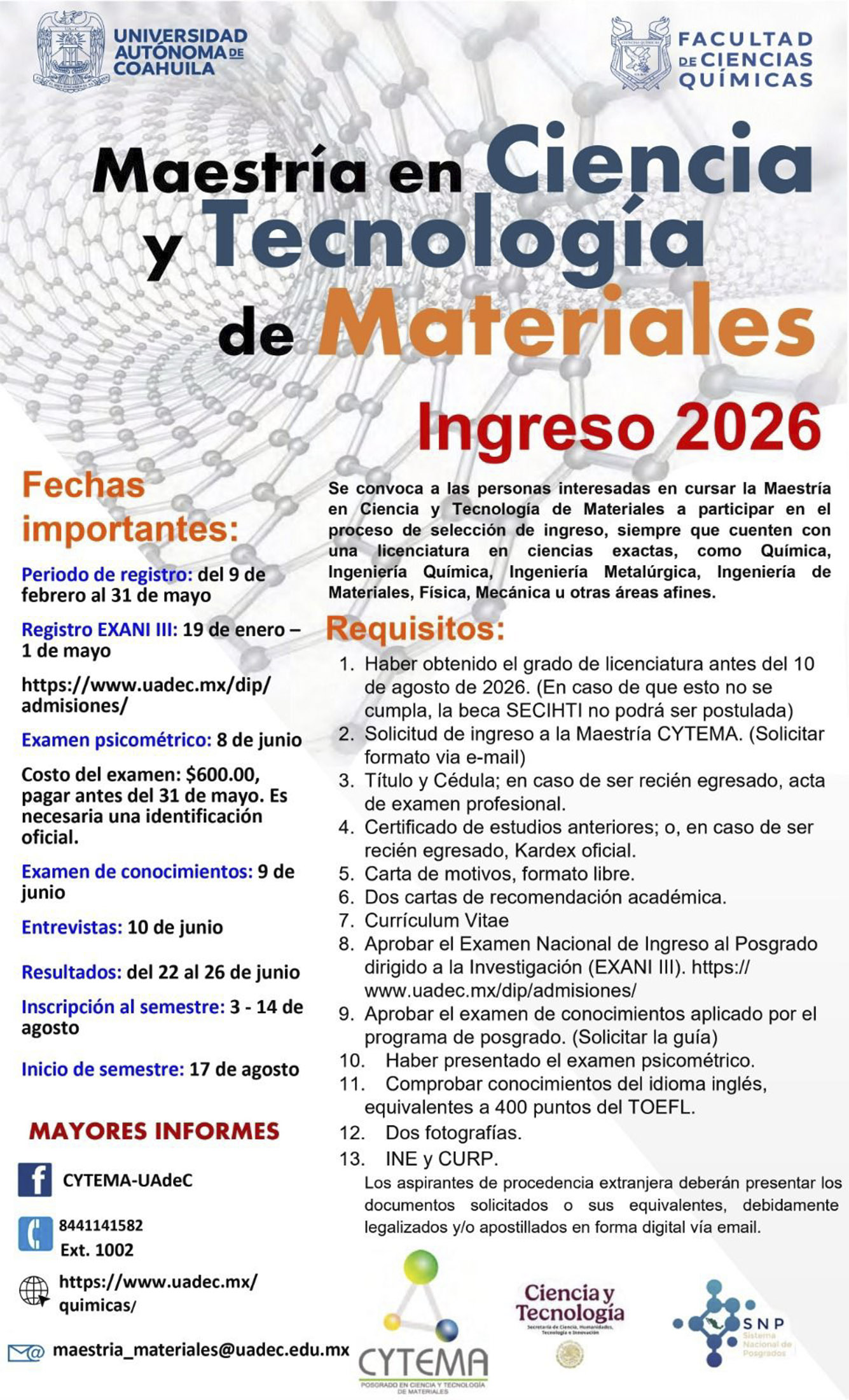 Para más información, visitar la página de Facebook https://www.facebook.com/cytema.uadec, comunicarse al teléfono (844) 114 1528 o al correo maestria_materiales@uadec.edu.mx.