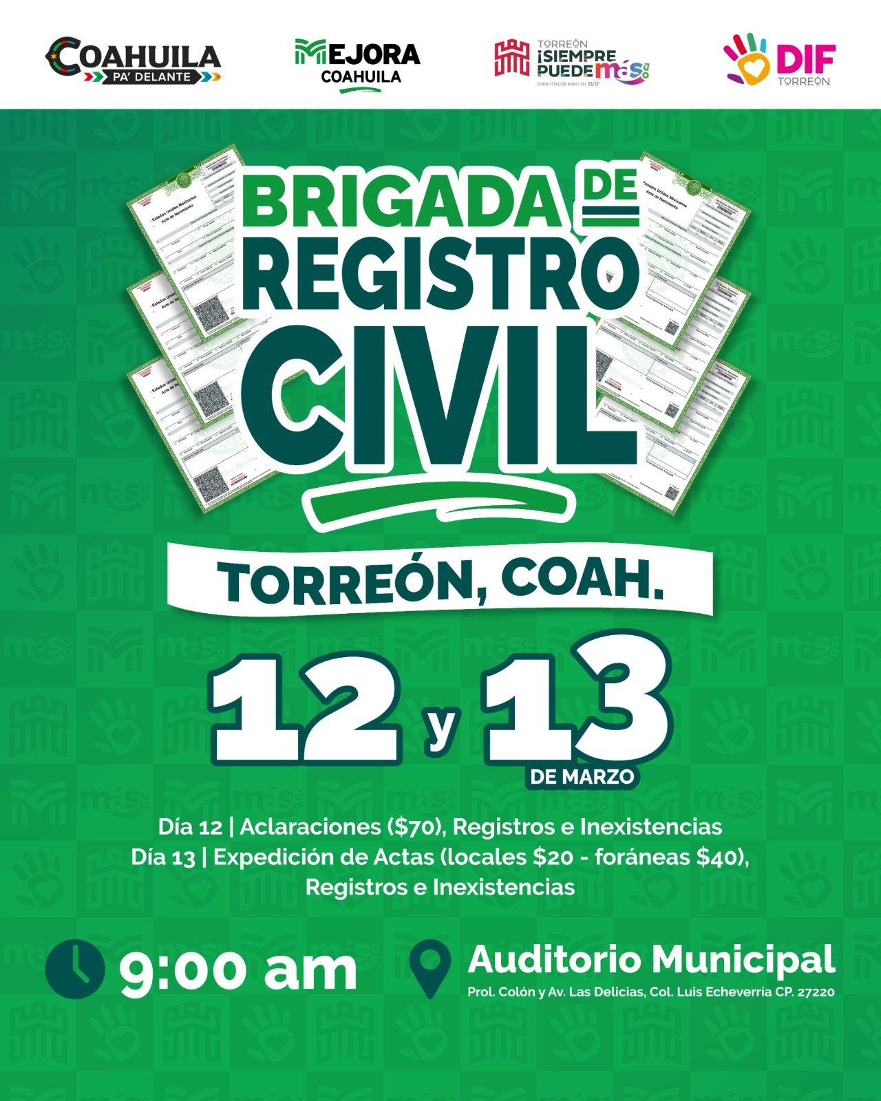 Este 12 y 13 de marzo, se llevará a cabo en el Auditorio Municipal de Torreón, la primera Macro Brigada de Servicios del Registro Civil de Coahuila, organizada por el Gobierno del Estado en coordinación con la Administración Municipal, a través del Sistema para el Desarrollo Integral de la Familia (DIF) Torreón.