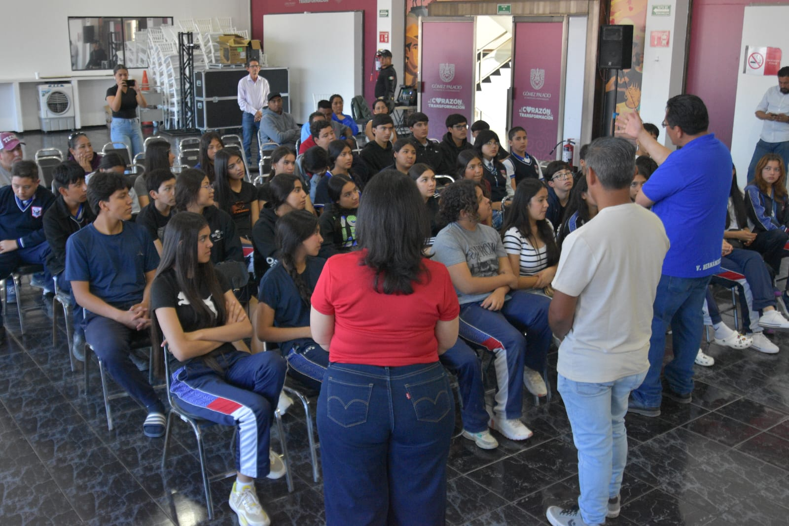 La alcaldesa de Gómez Palacio, Betzabé Martínez Arango, dio la bienvenida a estudiantes de la Escuela Secundaria General Ignacio Manuel Altamirano, provenientes de la ciudad de Durango, quienes visitaron la Presidencia Municipal durante su estancia en el municipio.