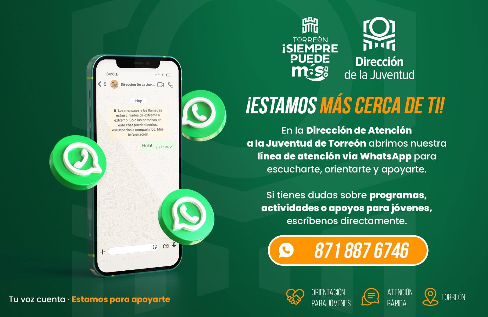 La Dirección de la Juventud de Torreón informa a la ciudadanía sobre la puesta en marcha de una nueva línea de atención a través de WhatsApp, con el propósito de fortalecer los canales de comunicación directa con el sector de la población al que representan.